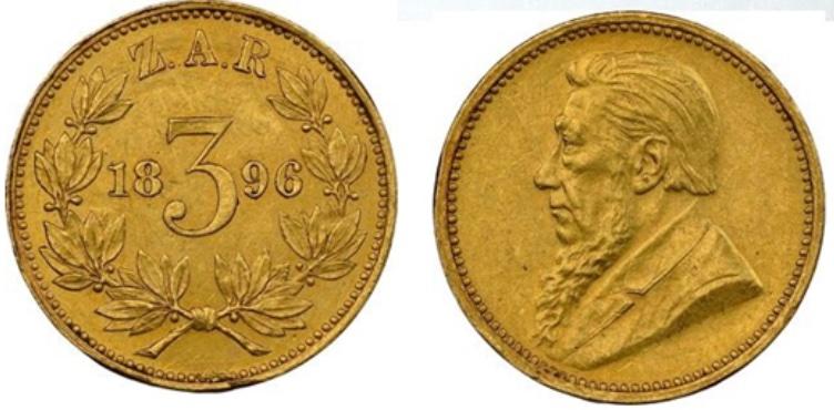 Paul Kruger’s Zuid-Afrikaansche Republiek (ZAR) struck silver threepence bearing his effigy from 1892 until 1897. Gold specimens were struck bearing the dates 1894 (rumored that only 2 or 3 exist), 1898 (of which 215 were struck) and 1896, last mentioned unique and only recently discovered and then certified by NGC – see picture below.