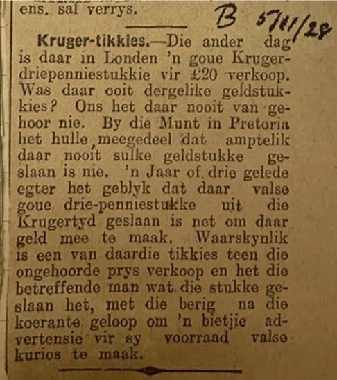 The other day in London a gold Kruger threepence piece was sold for £20. Were there ever such coin pieces? We have never heard of it. The Mint in Pretoria informed us that officially such coins were never struck. A year or three ago some fake gold threepence pieces were struck from the Kruger period only to make money from them. Probably one of these Tickeys was sold at this unheard-of price and the man who struck them then reported it to the newspapers to advertise his stock of fake curios.