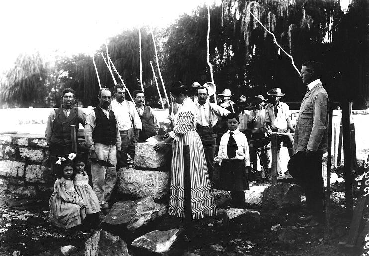 This photo was taken when a corner stone was laid during the building of the Boyd residence. Mrs Boyd is doing the honours with Dr Boyd (right), her son and the two elder Boyd daughters looking on, apart from the construction workers. This photo was for many years wrongly attributed as the laying of the corner stone of the Convent. (August D’Ange D’Astre)