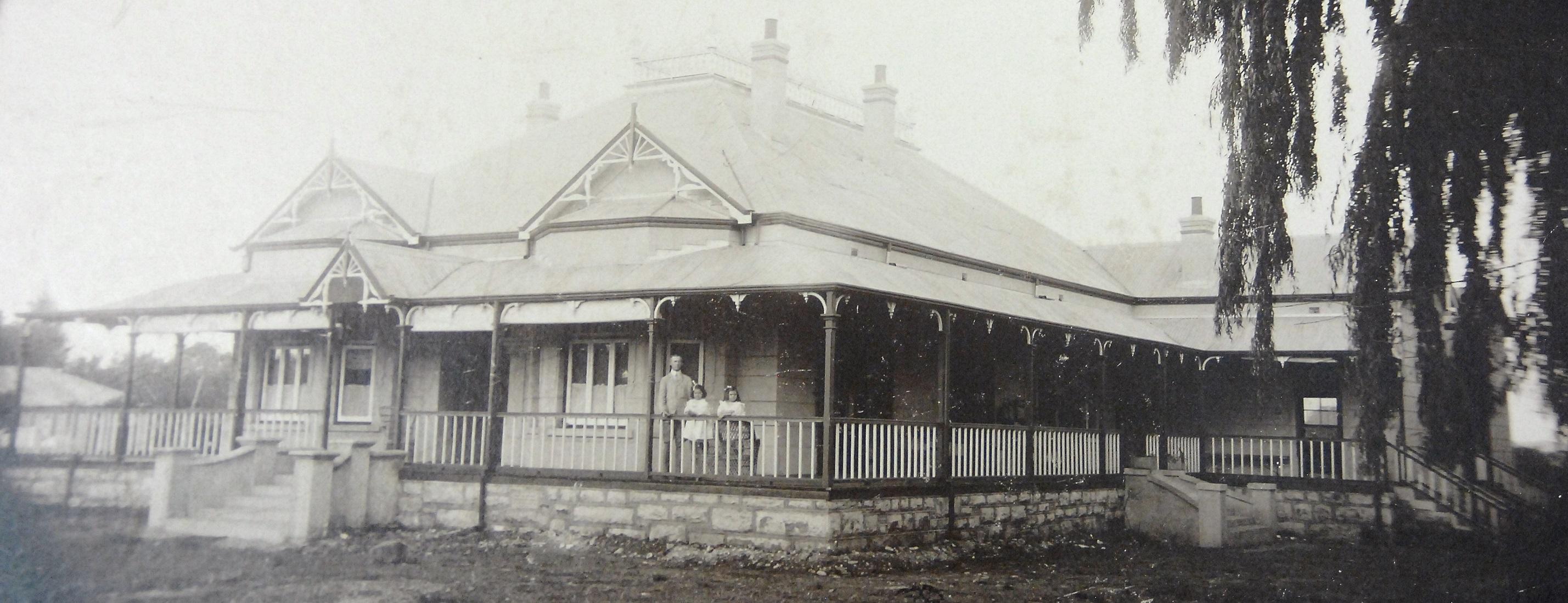 The house Dr Alan Boyd built still stands across from the DR Mooirivier church in Church Street (Walter Sisulu). Dr Boyd and two of his daughters stand on the veranda. (Potchefstroom Museum)