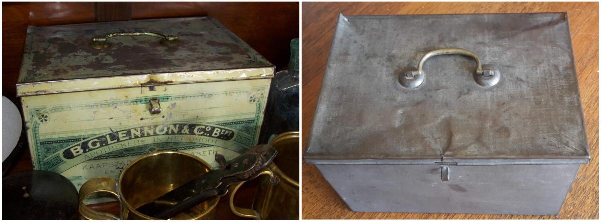 The important role the Lennon “Huis Apoteek” played in the households of our forebears, is personified by this tin. It is exactly the same as the one above, but was used so much that all the paint wore off. It was the Lennon tin of my grandmother, Lenie Lombaard of Olifantshoek. Legend in the family has it that she never travelled without this tin and its contents. When you hold up the bottom of the tin to light, small pinpricks of light shine through indicating how thin the bottom is from wear and tear. The sad truth is that these inadequate medicines did not always save lives. My grandparents lost two children in infancy. (Lennie Gouws)