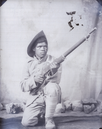 Print from a glass negative showing unknown black male – clearly an active participant during the Boer War. This image was found amongst a donated batch of other “insignificant” glass slides. The author assumes that this image might have been taken in Graaff Reinet. Photographs of black soldiers, whether they fought on the Boer or the British sides, are scarce. Originating format – from a glass negative.