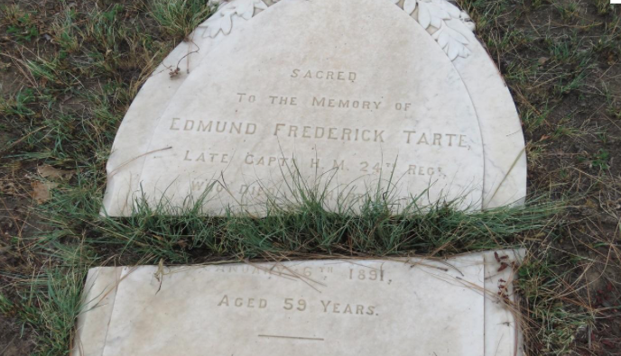 There is a historic tombstone which links Harrismith with the Anglo Zulu War of 1879. This stone lies about midway between the two Basuto War graves and the British Garden of Remembrance. Unfortunately it has broken into two and now lies flat on the ground and can therefore easily be overlooked. The epitaph reads “Sacred to the memory of Edmund Frederick Tarte, Late Capt. H. M. 24th Regt. Who died at Harrismith January 6th 1891, Aged 59 Years.”