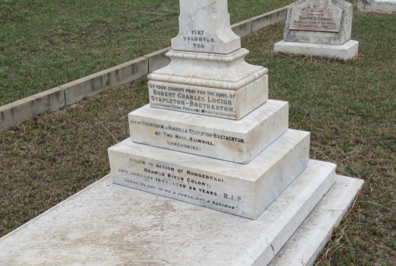 There is a rather touching tombstone requesting the passerby to charitably pray for the soul of Lieutenant Robert Charles Lucius Stapleton-Bretherton who was killed in action at Rondedraai. The epitaph is headed by the Latin proverb “Fiat Voluntas Tua” (Thy Will be Done) and ends with the following exhortation: “Jesus! Be not to me a Judge. But a Saviour”. This stone may have been erected some period after the Boer War ended when emotions had cooled.