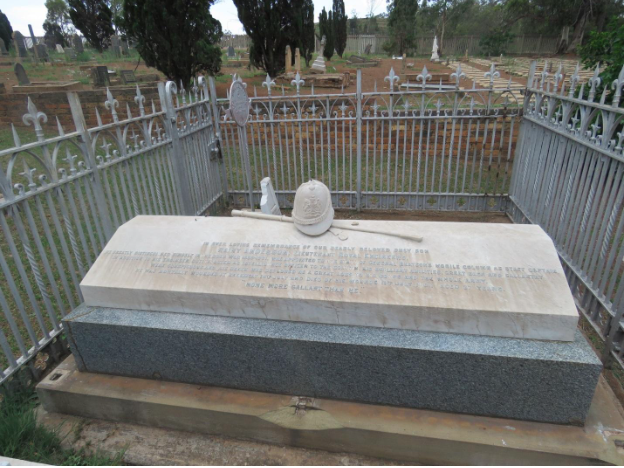 Grave of Lieutenant Rainy Anderson. The tablet previously erected in St Paul’s London is visible next to the helmet. Note the empty sheath a symbol of death. (SJ de Klerk)