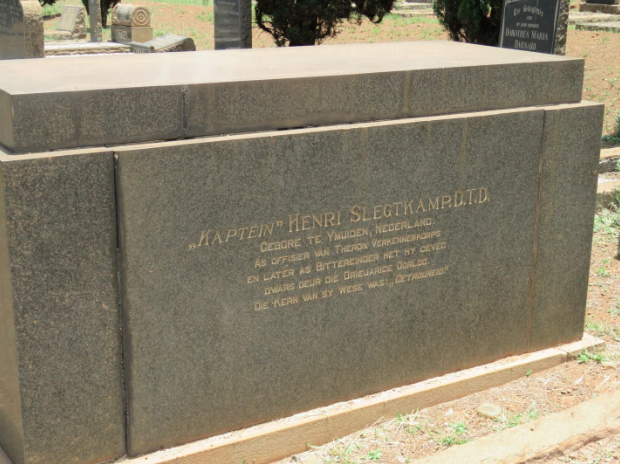 Slightly to the north-west of the grave of Toerien is a monumental tombstone to Hendrik Frederik (Henri) Slegtkamp (1873 – 1951), another famed Boer scout from the Boer War.
