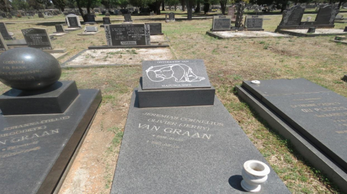 In Section 12 of the Dutch Reformed precinct, lies the interesting grave of Jerry van Graan (1908 to 1987). His grave is covered by a large engraving of the well-known golden rhinoceros of Mapungubwe and the inscription ‘Ontdekker van Mapungubwe’ (Discoverer of Mapungubwe).