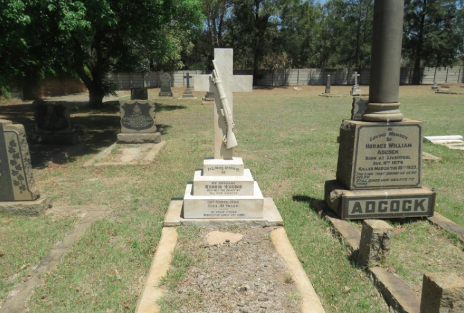 Nearby is a sad tombstone to Johan Christian Scheepers killed in a mine accident on 21 November 1921, and his son Frederick Johannes Scheepers killed in an air crash with the SAAF on 10 September 1942.