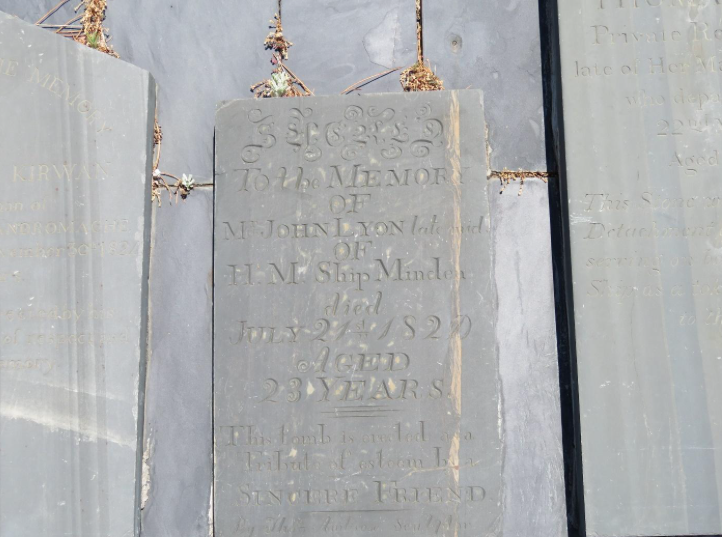 Attractive tombstone engraved by Thomas Ambrose in memory of Midshipman John Lyon of HMS Minden, erected as a tribute of esteem by a sincere friend. (SJ de Klerk)