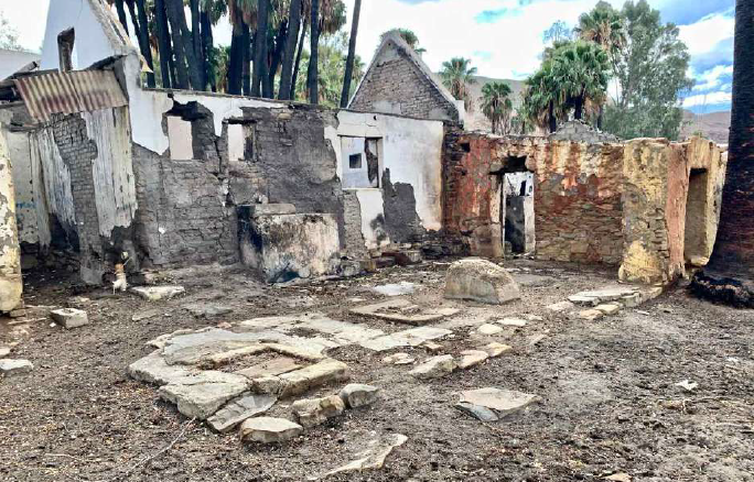 Exterior of Leipoldt House after the fire. This building is most probably the original Rietmond farmhouse, pre-dating the arrival of the Rhenish missionaries by about 30 years. The uncharacteristic semicircular stoep appears to have been used as a podium from which open air services were conducted before the church was completed, explaining its non-traditional shape. (ARCON, 25 October 2019)