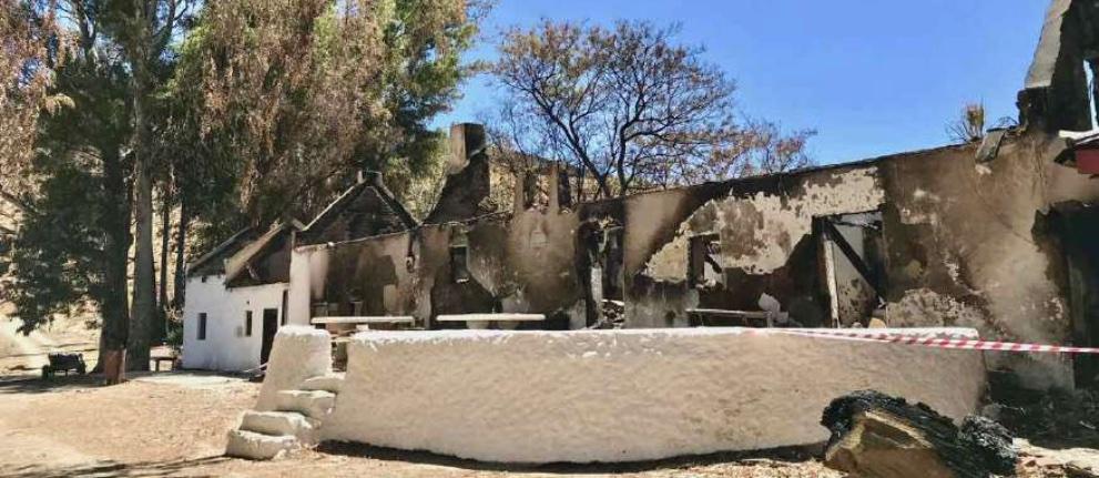 The Blacksmith’s Shop was the first building to be gutted in the fire, having been closest to where it started. The age of the building is not known but judging from its plastered masonry construction which is similar to that of Leipoldt House, it could be that the part closest to the adjoining threshing floor is another of the original Riedmond farm structures. The Blacksmith’s Shop is on two levels and, with the threshing floor adjacent to a stream has, on occasions, created the mistaken impression that this was once a mill. The lower level contains the remains of a forge which would have been strategically placed for attending to wagon wheels damaged during the torturous mountain descent to the settlement. (ARCON, ARCON, 24 January 2019)