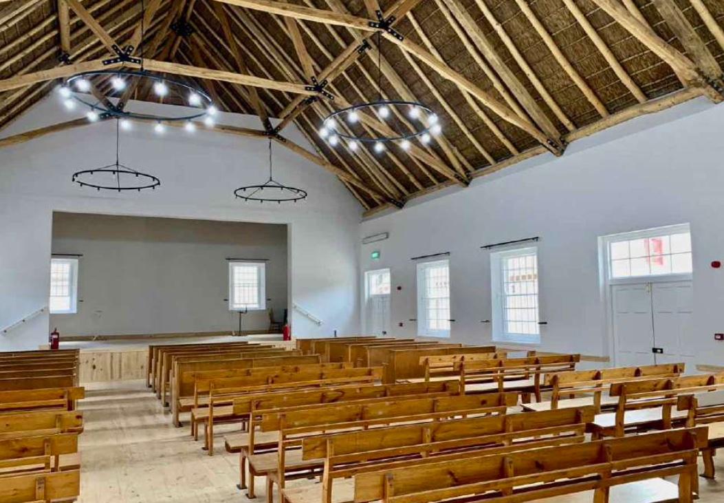 The interior of the Community Hall after restoration was practically complete. The roof trusses are a more rustic re-design of the destroyed originals, which had been made of uniformly turned members. The simple chandeliers were specially designed for the interior. (ARCON, 9 July 2020)