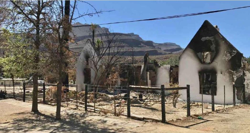Aerial view showing the gutted state of some of the buildings in the town centre after the fire. Top centre are the remains of Leipoldt House with its T-shaped plan and semicircular stoep. To the left are the remains of the old Mission Stores building, the first school building in the settlement. Below are the remains of the Community Hall. The Old Blacksmith’s Shop (Smitswinkel) where wagon wheels were repaired after a torturous trip down the mountain pass is just visible on the extreme upper right. The latter was the first building to be gutted in the fire. The road on the bottom right enters Wupperthal from the pass. (Goal Zero Consulting)