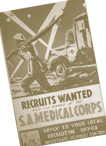 However, the outbreak of war in September 1939 brought a sudden change in attitude and, like tens of thousands of other South Africans, he volunteered for full-time military service. As he suffered severely from a duodenal ulcer he was to his great chagrin rejected by the Union Defence Force (UDF), in spite of his pre-war membership of the ACF. However, a break in the dark cloud of rejection soon appeared. At the time he was employed in the Johannesburg City Health Department and one day some months later a member of staff came rushing into the office to report that the doctor on duty in the recruiting section at the Drill Hall was old and allegedly almost blind: now was the time to get in. Accordingly my father and several colleagues who had been similarly rejected rushed off to the Drill Hall and, mirabile dictu, all passed their medical! In my father's case his classification had miraculously changed from 'Unfit for all forms of service with his unit or corps' to 'Fit/A1' 2, and he was assigned to the 6th Hygiene Company, South African Medical Corps. However, the UDF soon discovered the error of its ways and my father's medical category was at once lowered to one which allowed him to only serve within the Union, and not "Up North". Fortunately, to his great satisfaction he was still permitted to wear the famous Red Flash, an orange-scarlet shoulder tab which signified the wearer's willingness to serve outside the borders of South Africa.