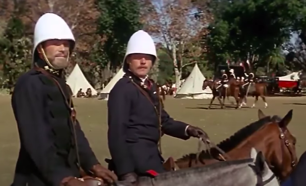 For this purpose, a squad of near company size was drilled solidly until they could present arms like a machine. The moment had come and Peter O’Toole, as Lord Chelmsford, regally mounted an off-white horse, approached with his Staff. Sergeant R Gill bellowed the appropriate command–there was a crashing and stamping of feet–and Chelmsford’s horse took off. Peter O’Toole battled to control the beast, but to no avail and he fell off – fairly gently, fortunately.