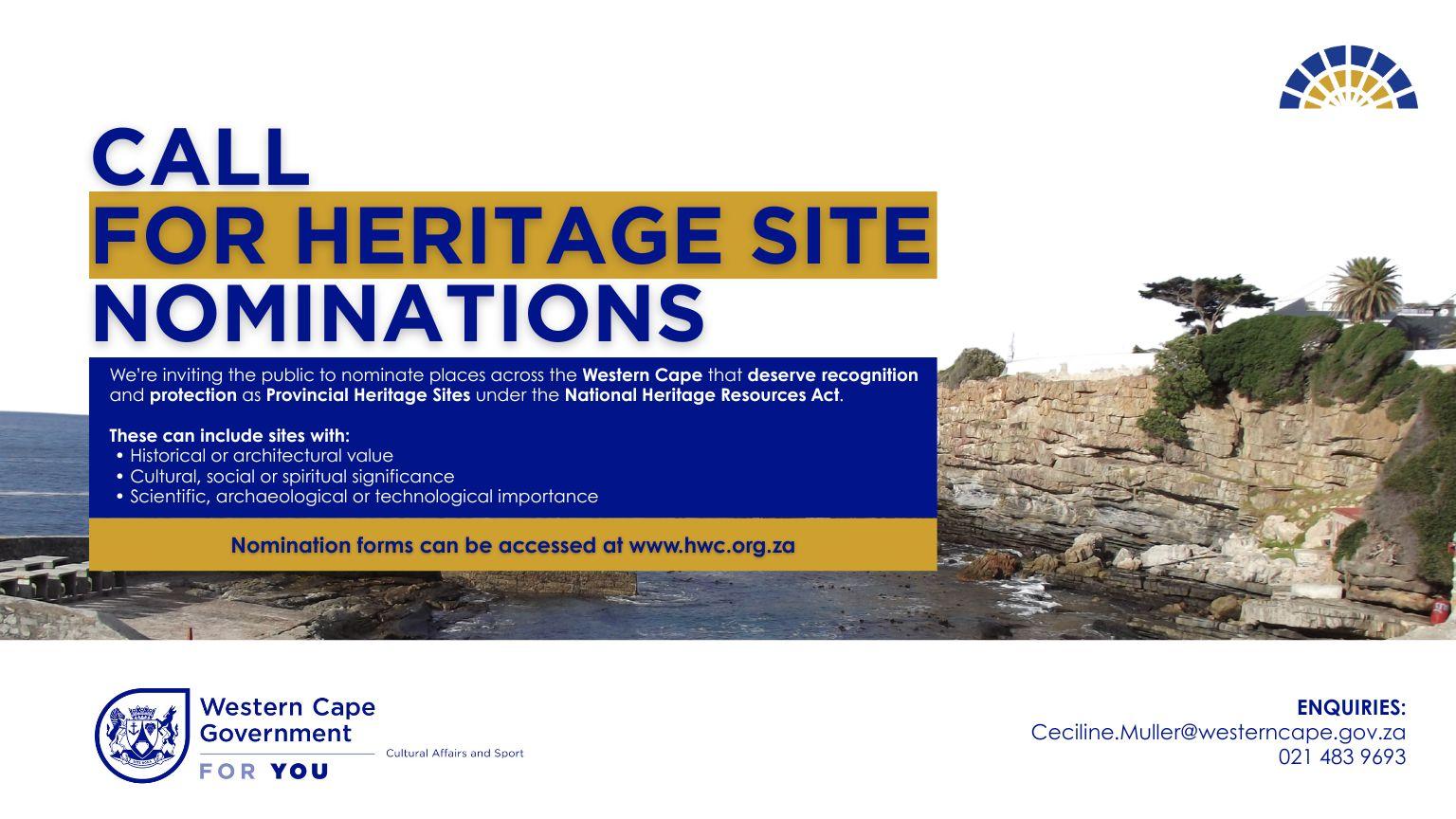 We’re inviting the public to nominate places across the Western Cape that deserve recognition and protection as Provincial Heritage Sites under the National Heritage Resources Act. Your nomination helps protect our shared past and shape our future. Nomination forms are available online at www.hwc.org.za.