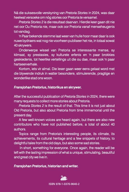 Pretoria Stories 2 is available at some Exclusive Books outlets as well as Protea Book House in Hatfield, Pretoria. A number of the stories have some heritage and historical value.