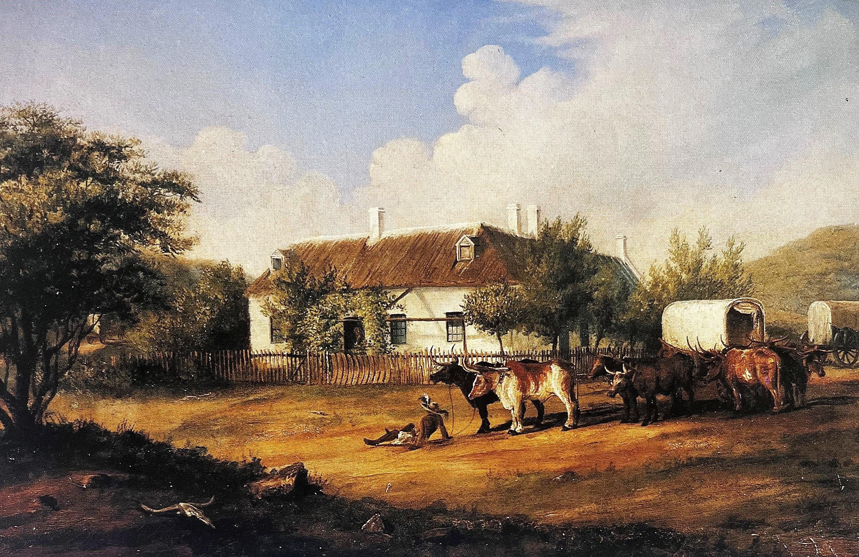 'Residence of Mr Knowles, Koonap Post, Albany' Signed and dated 'Graham's Town Jany 15 1849', signed inscribed with the title and dated 'Jany 15 1848 [1849]' on reverse. Oil on canvas, 51 x 79 cm. P Col. Prov: Stanley Gordon Tomlinson; Welz 6.11.1989, lot 255