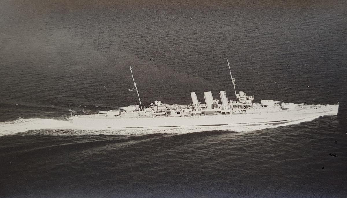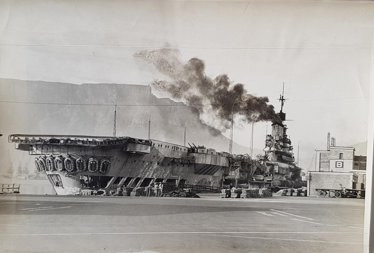 Here is an aerial photograph of the heavy cruiser, HMS Dorsetshire at speed: a sleek, silver streak of naval power cutting through the wine dark sea. The caption tells us: She was in Cape Town numerous times between December 1939 and December 1941. She was sunk in April 1942 by the Japanese along with her sister ship HMS Cornwell. The war saw the end of so many huge floating gun platforms as aircraft carriers changed the very nature of sea battles.